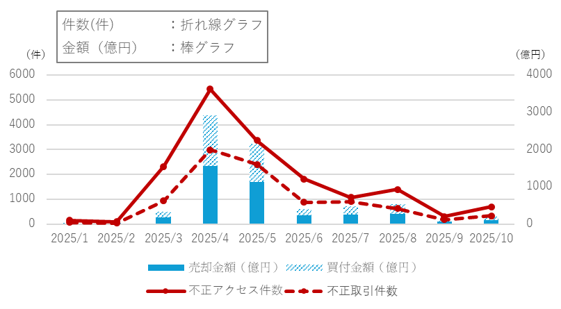 金融庁が公表している不正アクセス・取引被害レポートによると、2025年4月・5月には急激な被害増加が確認されています。